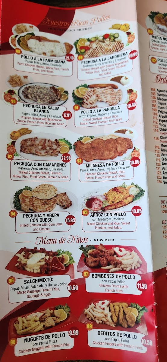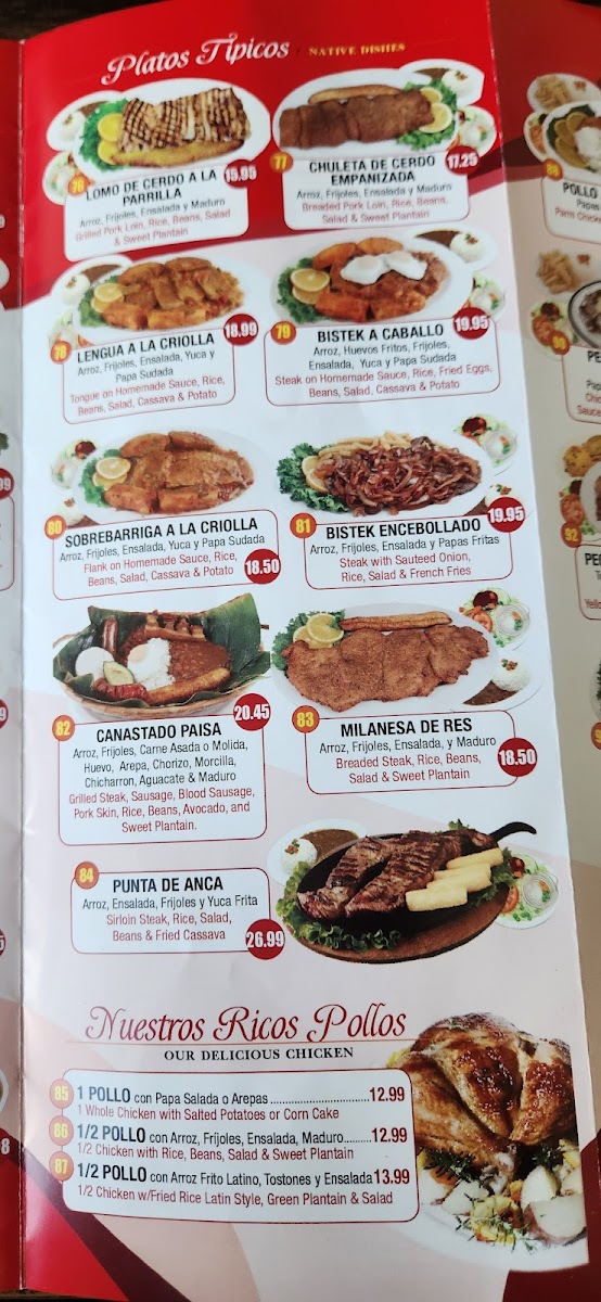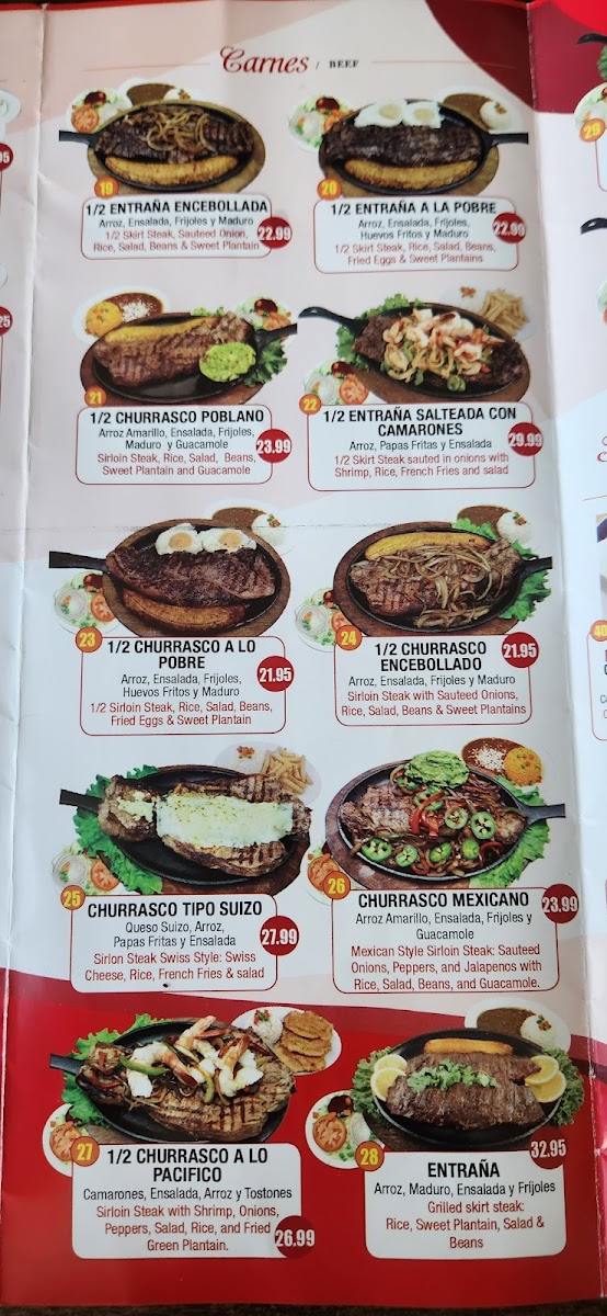 Arroz, ensalada, frijoles y maduro / ½ skirt steak, sautéed onion, rice, salad, beans & sweet plantain.